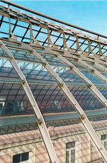 The shopping arcade, which was given listed status in 1986 and rightly considered one of the most innovative monuments in the history of urban planning in Europe, was to be restored for its 150th anniversary. The arcade's glory had become somewhat tarnished by the dubious alterations of recent decades, and required a high-quality restoration, based on concrete historic and scientific research. All the façades were re-painted in the original colours. As to the imitation marble, since complete removal would have been financially impossible, craftspeople were commissioned to restore the sections in the original spirit. Appropriate lighting was installed, contributing to the enhancement of the entire project. All the window frames, joinery and display windows of the shops were harmonised, by restoring altered elements to their original typology. As the glass canopies had never undergone thorough restoration, it was important to find a lasting solution to the problems of waterproofing and stability, while maintaining the finesse and luminous quality of the structure. The essence of the steel structure was able to be conserved, while the system for securing the glass was entirely redesigned by the architects to cope with problems of expansion / contraction, waterproofing and replacement of broken panes. Previously, they had been attached with putty directly onto the structure, now the glass is held between two stainless steel glazing beads bolted to the structure. The watertight seal is provided by a polyurethane seal held in a channel in the extension of the upper end of the glazing bead. The contemporary solution makes the arcade even lighter. Sliding ladders on rails fixed to the outside of the canopy make it easy and safe to access the whole area, and carry out maintenance, which will ensure that the site remains in excellent condition for the future.